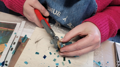 Au fil du week-end, j'ai accompagné les élèves dans chaque étape de leur création : choix du design, découpe des tesselles à la marteline, assemblage et finition.